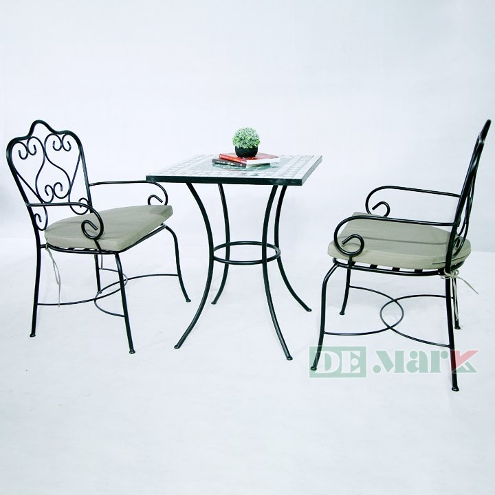 Ghế ngồi được làm từ sắt uốn, đơn giản nhưng không kém phần xin đẹp, phong cách sắt uốn thích hợp cho nhà hàng cafe, cafe sân vườn, với mặt bàn được ghép ngẫu nhiên từ những mảnh đất nung, phong cách Mosaic hiện nay rất được ưa chuộng trong trang trí sân vườn, một phong cách mới, lạ và đẹp.