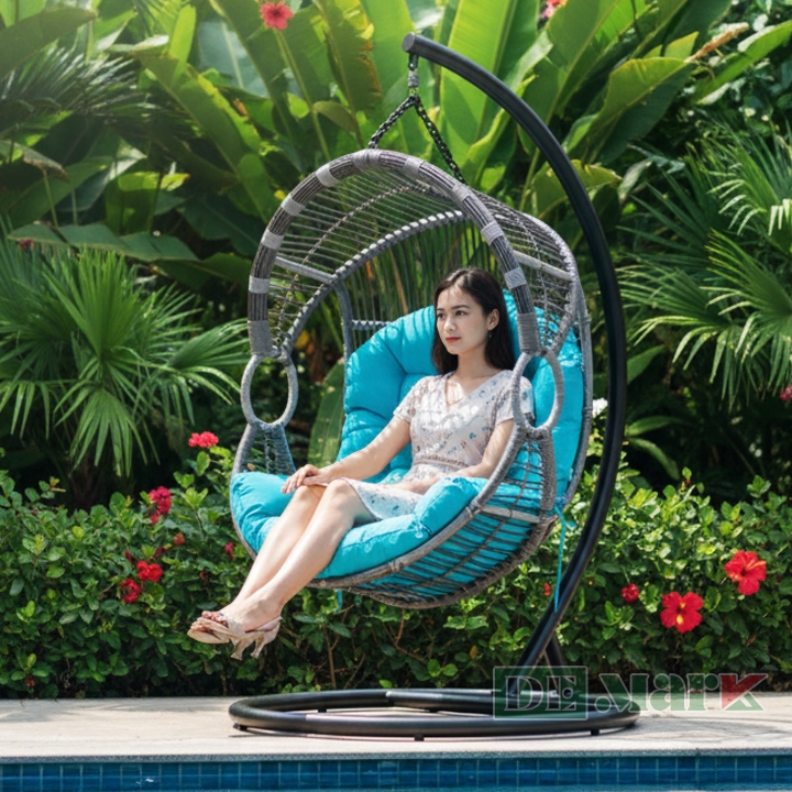 Nhựa giả mây là chất liệu thân thiện với môi trường, đem lại sự yên tâm cho người sử dụng. Ngoài ra, ghế xích đu này không chỉ thích hợp cho những khu vườn nhiều cây xanh mà còn là điểm nhấn hoàn hảo cho ban công, tầng thượng, hoặc các khu vực ngoài trời khác.